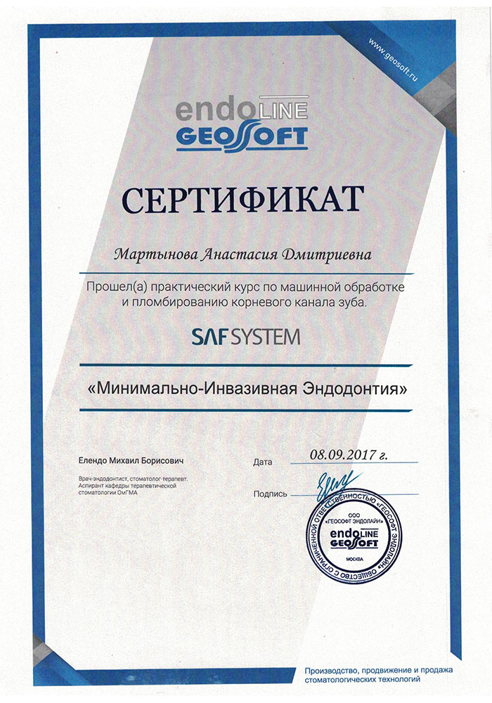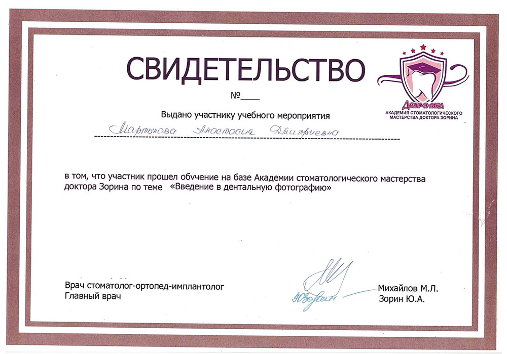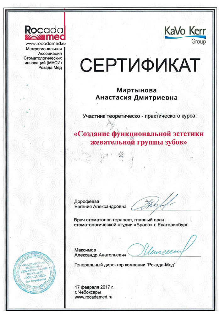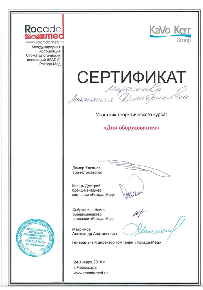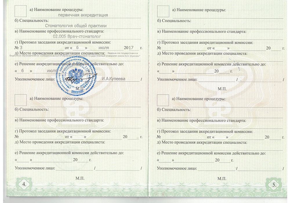 - Свидетельство об аккредитации специалиста 332400046277 от 06.07.2017 г. Федеральное государственное бюджетное образовательное учреждение высшего образования "Чувашский государственный университет имени И.Н. Ульянова" по специальности "Стоматология общей практики".