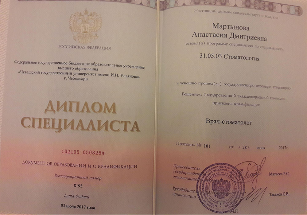 - Диплом специалиста 102105 0503284 от 03.07.2017 г. Федеральное государственное бюджетное образовательное учреждение высшего образования "Чувашский государственный университет имени И.Н. Ульянова" присвоена квалификация "Врач-стоматолог".