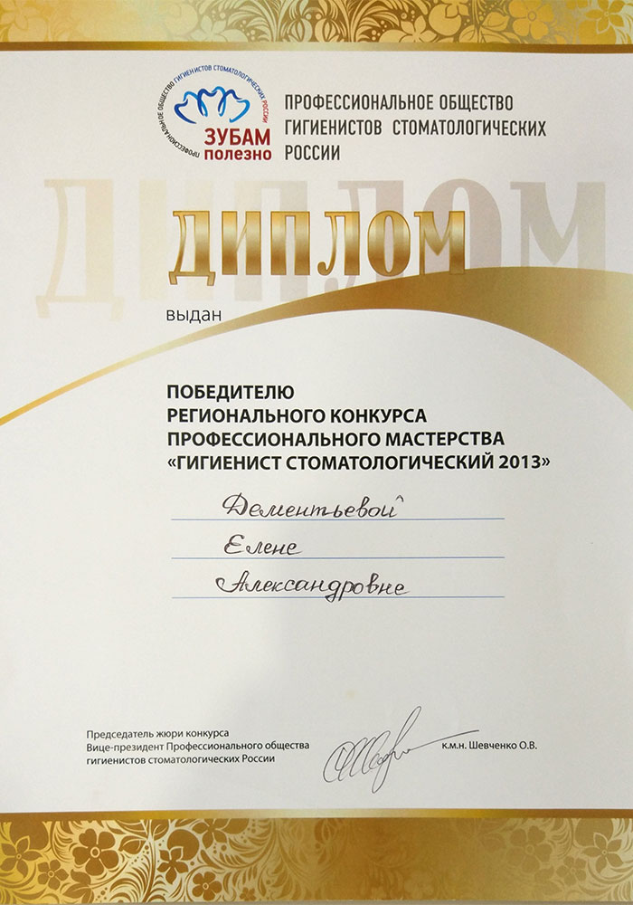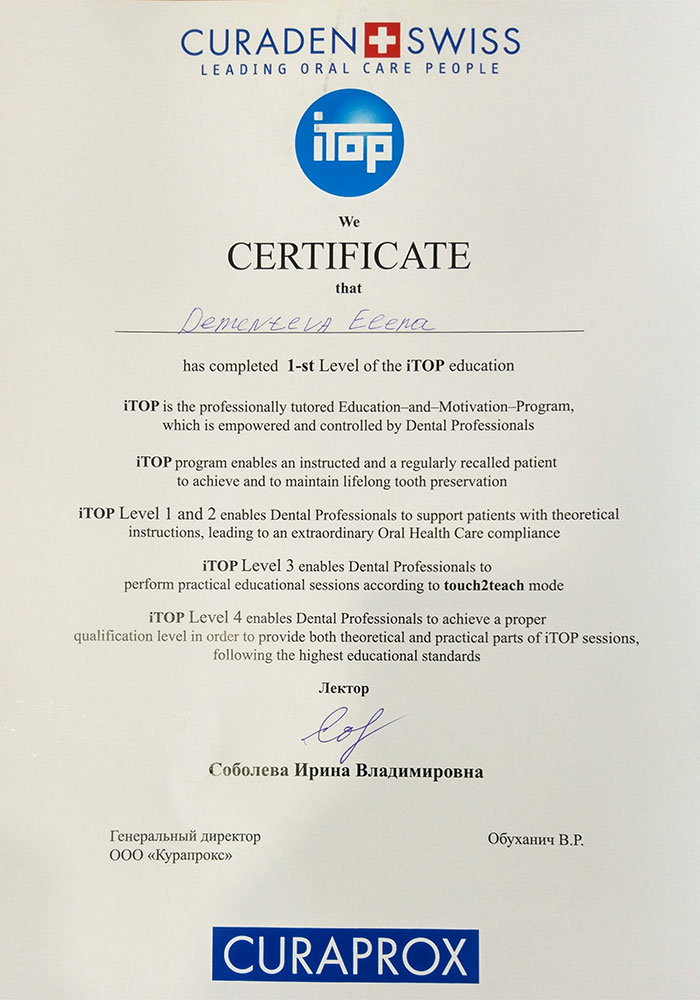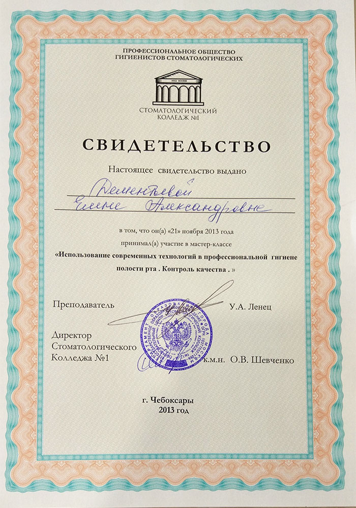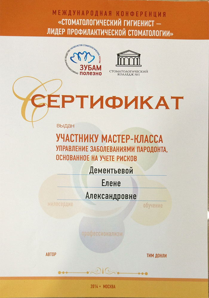 - Диплом о профессиональной переподготовке ПП-I №342273 от 22.10.2008 г. НОУ-Образовательный центр "Стоматологический колледж №1" по программе профессиональной переподготовки "Стоматология профилактическая".