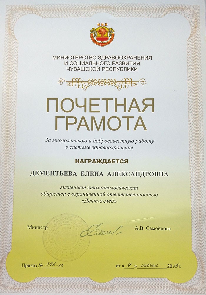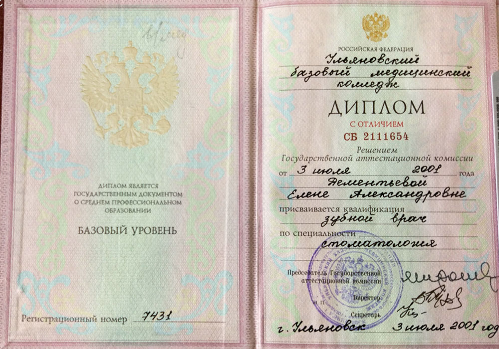 - Диплом с отличием СБ №2111654 от 03.07.2001 г. "Ульяновский базовый медицинский колледж" присвоена квалификация "Зубной врач".