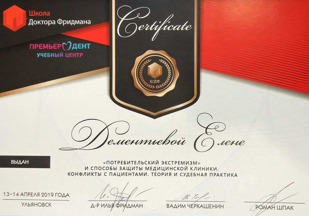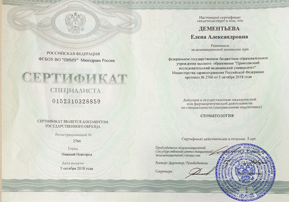 - Сертификат специалиста 0152310328859 от 05.10.2018 г. Федеральное государственное бюджетное образовательное учреждение высшего образования "Приволжский исследовательский медицинский университет" Министерства здравоохранения Российской Федерации по специальности "Стоматология".
