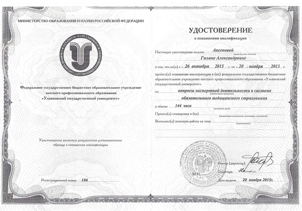 - Удостоверение о повышении квалификации №186 от 20.11.2015 г. Федеральное государственное бюджетное образовательное учреждение высшего профессионального образования "Ульяновский государственный университет" по "Вопросам экспертной деятельности в системе обязательного медицинского страхования".