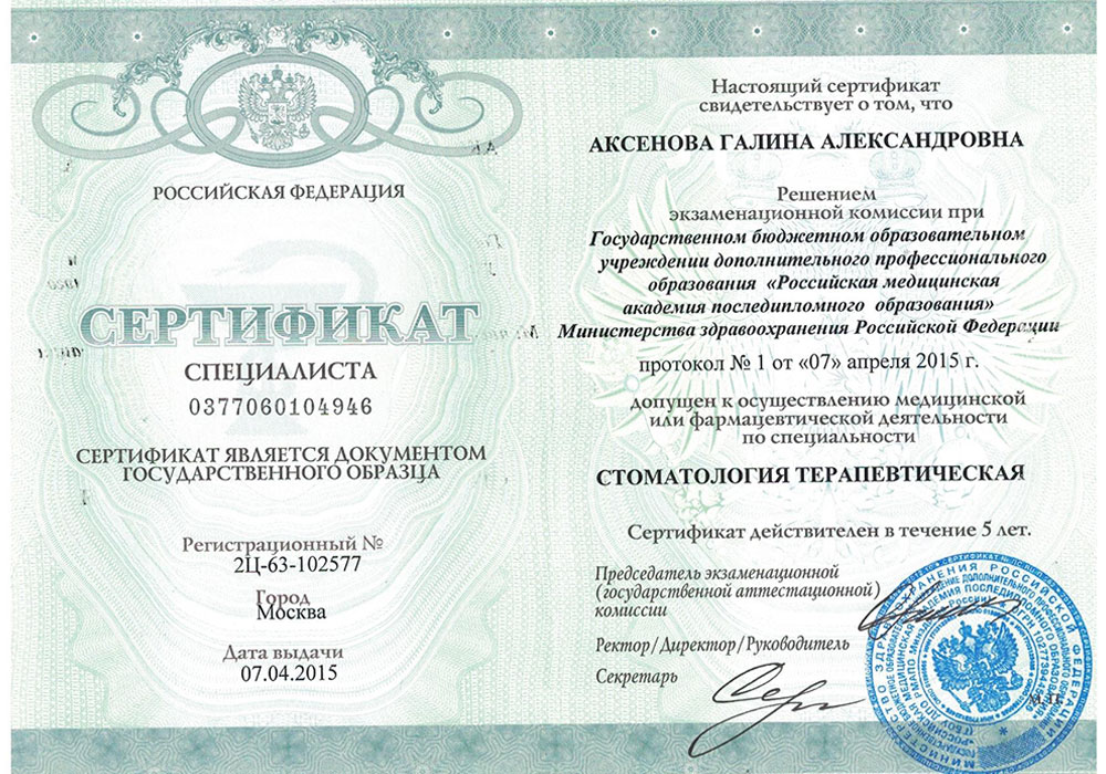 - Сертификат специалиста 0377060104946 от 07.04.2015 г. Государственное бюджетное образовательное учреждение дополнительного профессионального образования "Российская медицинская академия последипломного образования" Министерства здравоохранения Российской Федерации по специальности "Стоматология терапевтическая".
