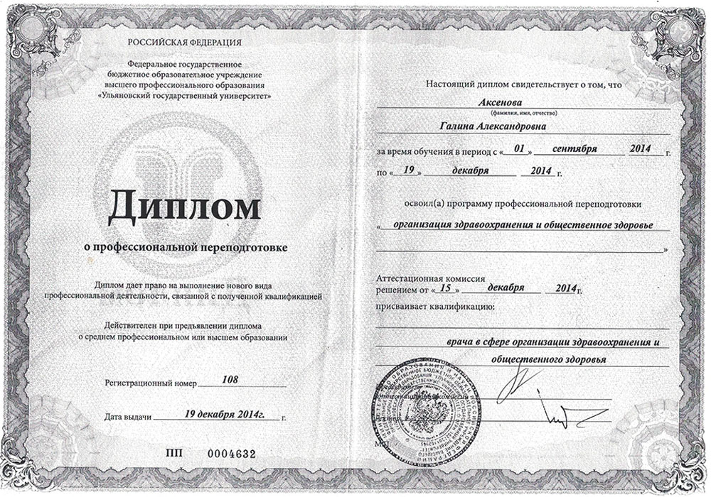 - Диплом о профессиональной переподготовке ПП 0004632 от 19.12.2014 г. Федеральное государственное бюджетное образовательное учреждение высшего профессионального образования "Ульяновский государственный университет" присвоена квалификация "Врач в сфере организации здравоохранения и общественного здоровья".