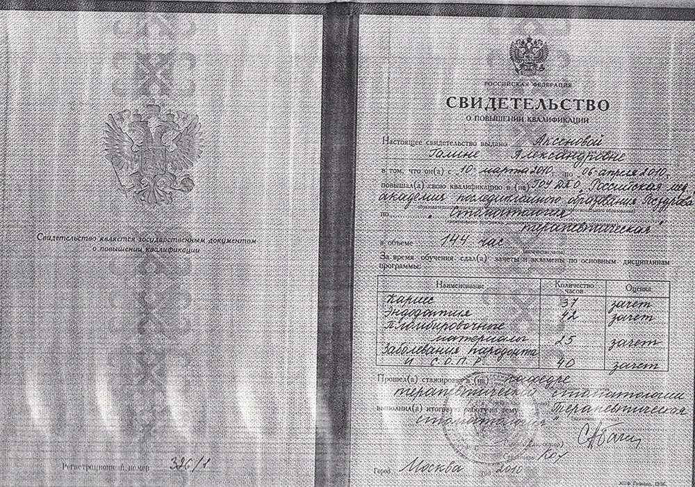 - Свидетельство о повышении квалификации №326/1 от 06.04.2010 г. ГОУ ДПО "Российская медицинская академия последипломного образования Росздрава" по специальности "Стоматология терапевтическая".