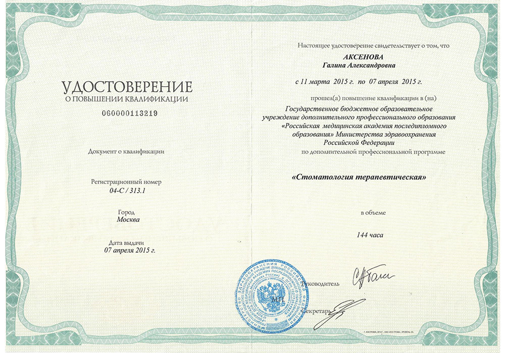 - Удостоверение о повышении квалификации 060000113219 от 07.04.2015 г. Государственное бюджетное образовательное учреждение дополнительного профессионального образования "Российская медицинская академия последипломного образования" Министерства здравоохранения Российской Федерации по дополнительной профессиональной программе "Стоматология терапевтическая".