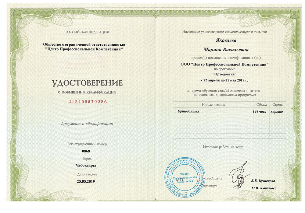 - Удостоверение о повышении квалификации 212409579286 от 25.05.2019 г. ООО "Центр Профессиональной Компетенции" по программе "Ортодонтия".