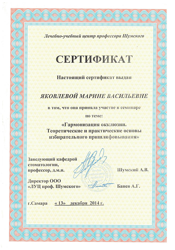 - Свидетельство о повышении квалификации №470 от 04.12.2009 г. "Самарский медицинский институт "РЕАВИЗ" по "Ортодонтии".